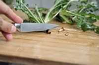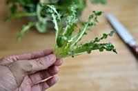 苦菜择掉干叶,清洗干净,用刀切掉苦菜的老根。