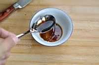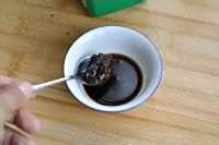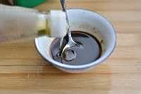 取干净小碗倒入一汤匙白糖,1/2汤匙味极鲜酱油,调入一汤匙凉拌醋,再挖入一汤匙葱伴侣酱,和匀,最后调进适量香油搅匀。