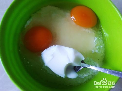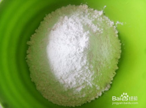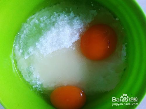 面粉放到盘中,打2个鸭蛋进去,加适量的白糖。
