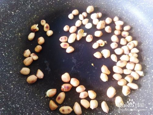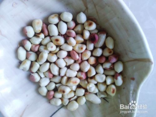 花生放到锅里用小火炒至脆香,然后铲上来,用手把花生衣搓出来。
