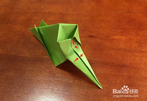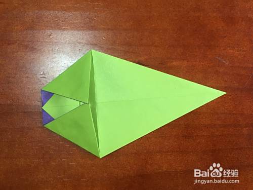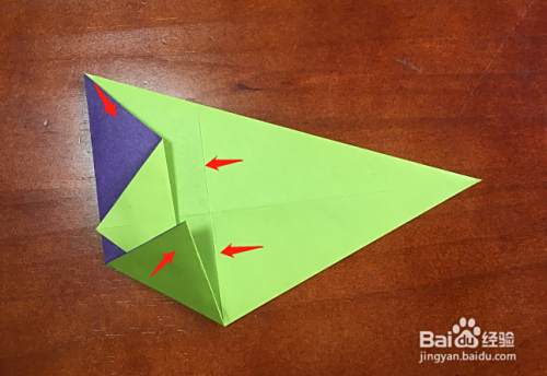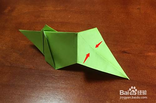 将两侧的角翻开,反向折叠下(下图2),然后沿着箭头所指竖线处将左侧部分往后折。