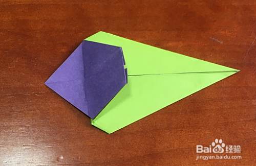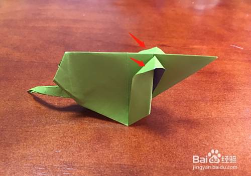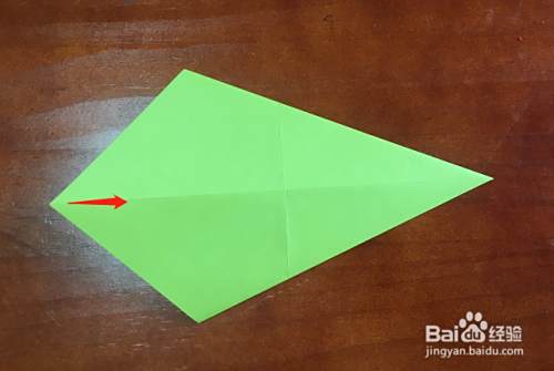 将彩纸竖起来,右边尖角向左对折下,折出折痕,展开,如图3,撑开,两边向内折叠,然后根部向上折叠下,老鼠尾部完成。
