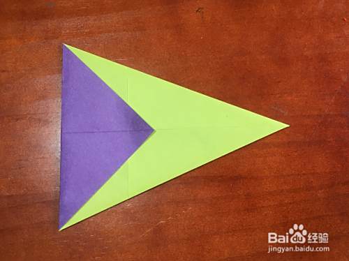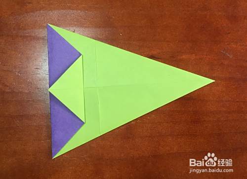 翻面,将外面的直角向左翻下,然后整张彩纸对折(下图3)。