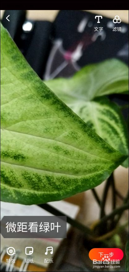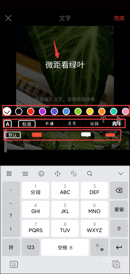 如图所示,输入你需要的文字如:微距看绿叶,图中三个方框,最上面是文字颜色调整,中间的是文字字体,最下面是给文字添加底色,可根据自己所需来选择.