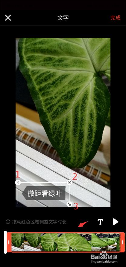 如图所示,文字输入好后,再调节文字位置,图中1是删掉文字,图中2是再次编辑文字,图中3是调整文字大小和角度(不建议调角度,因为一旦歪了很难再调正,这是不足之处),最后调节文字在视频中的显示时间(图中最下方的红色方框)把方框拖满整个视频即文字从头到尾显示.