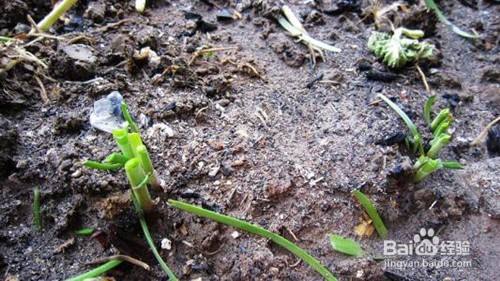 4、把带土的韭菜根放入挖好的小坑里,周围培上土,漏出韭菜根嫩芽。