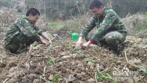用锹把发芽的韭菜根连土一块铲起来,要深挖,不要损伤韭菜根。