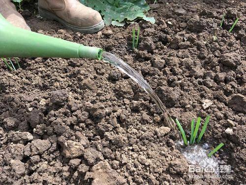 5、再给韭菜根坑里浇一些水,水要浇透。