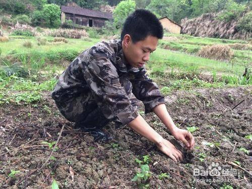 把移植韭菜根的土地翻土后,挖10个小坑。