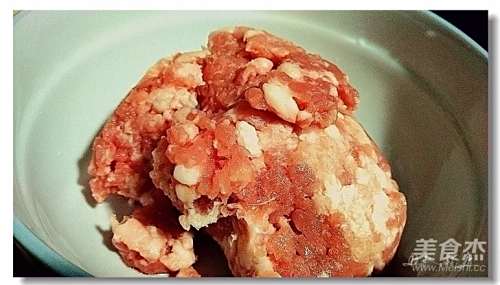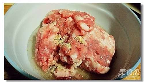 3肉粒中放盐、胡椒粉、料酒拌匀,拌肉间将姜葱水分次加入,再加玉米淀粉铰匀、将肉打上劲静置。
