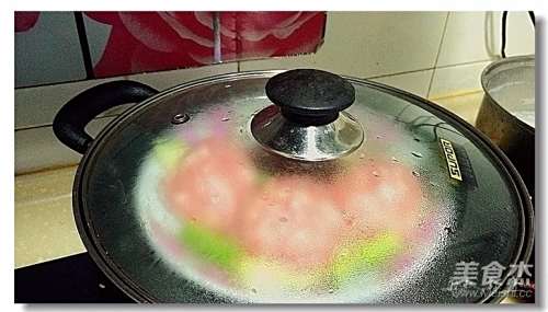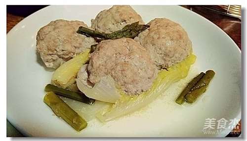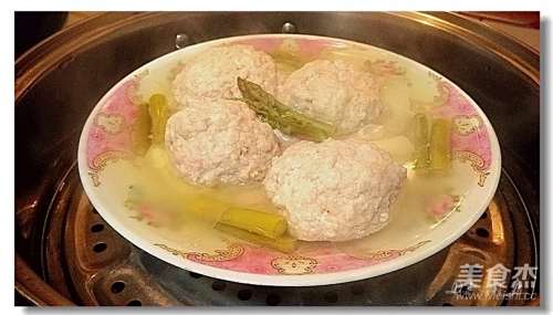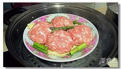 5将大肉丸等分四份,放在娃娃菜上,再放芦笋段,夹入上汽后的蒸锅內;