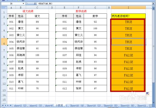 在工作中,我们经常需要判断两列字符串或数据是否完全相同。如图,语文成绩是语文老师提供的,数学成绩是数学老师提供的,现在要将之合并,只要先判断两个成绩单的学号是否相符,然后拷贝在一块就好了。怎么判断两列数据是否相同呢?