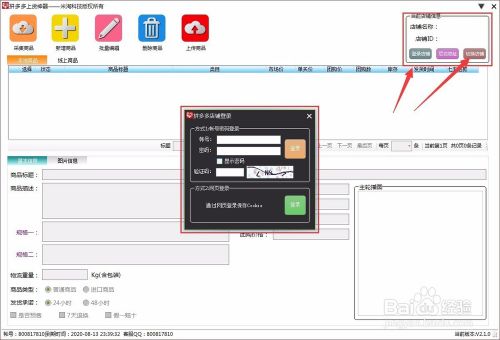 下载安装一个拼多多上货神器,打开进入软件,在这边点击登入店铺,输入店铺账号跟密码也可以同时切换多个店铺去上传