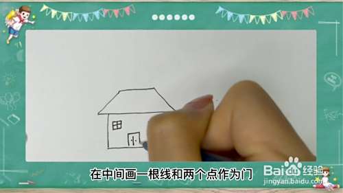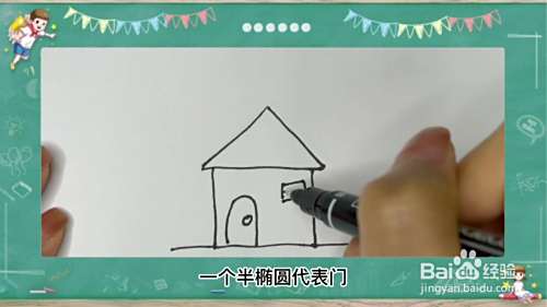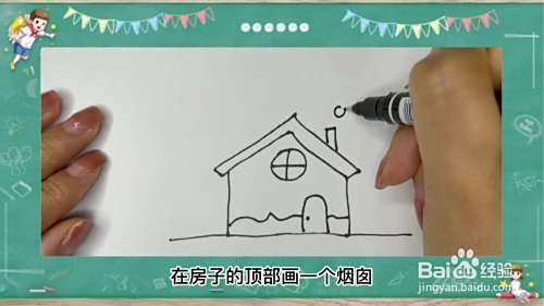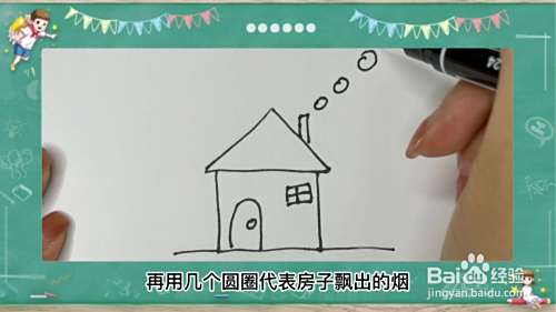 然后画一个田字代表窗户,一个半椭圆代表门,接着画出房子的烟囱,再用几个圆圈代表房子飘出的烟。