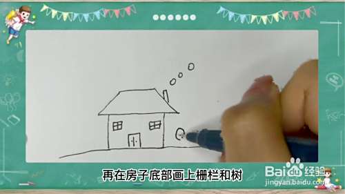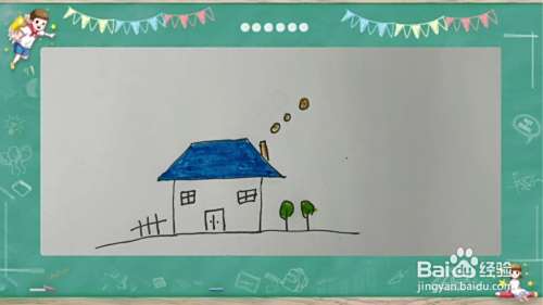 最后用蓝色涂满烟囱,用绿色涂满树、烟和烟囱,大型房子就画好了。