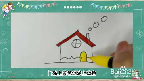 最后给房子的屋顶涂上红色、门涂上黄色、烟涂上蓝色,小型房子就画好了。