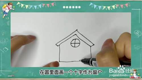首先画出两个互成角度的长条作为房子的烟囱,再画出一个只有三边的长方形,然后画一个圆,在圆里面画一个十字作为窗户。