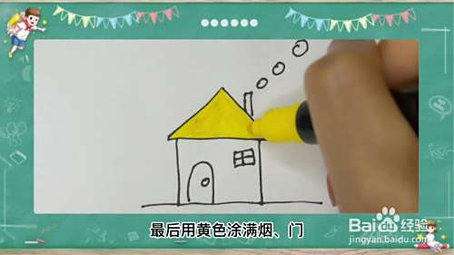 最后用黄色涂满烟、门、屋顶和烟囱,中型房子就画好了。