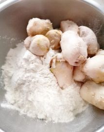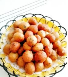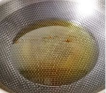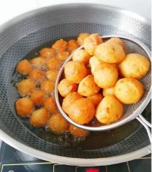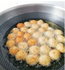 用勺子勺入油锅中(勺子勺完一个丸子,勺子要放入凉水中过一下,用不能丸子会粘在勺子上,用碗盛半碗水放旁边)。