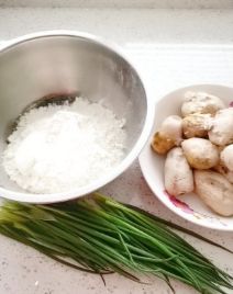 芋头剥掉外皮,准备好其它的食材(面粉、葱、盐、五香粉、辣椒粉)。