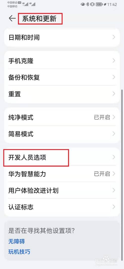 在华为鸿蒙系统手机上,通过手机设置开启开发者模式后,并通过系统和更新进入开发人员选项设置的方法。