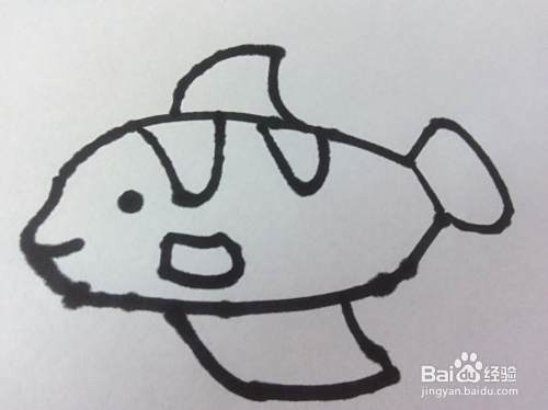 在小鱼的上轮廓线的下侧,画出两个像梯形的圆弧形。小鱼的简笔画就完成了。