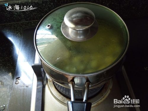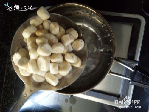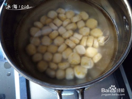先煮芋圆,小锅中加水煮沸,把放在冰箱冷冻的芋圆取出来;
