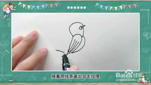 接着用线条画出鸟毛纹理。然后用直线画出树枝,