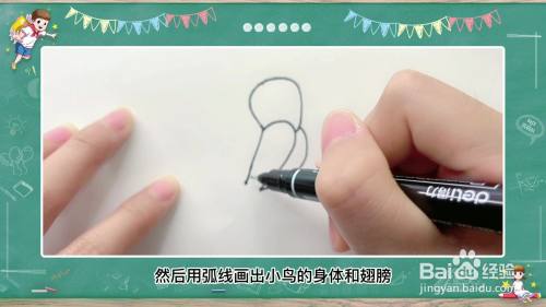 首先用半圆画出小鸟的头,然后用弧线画出小鸟的身体和翅膀,