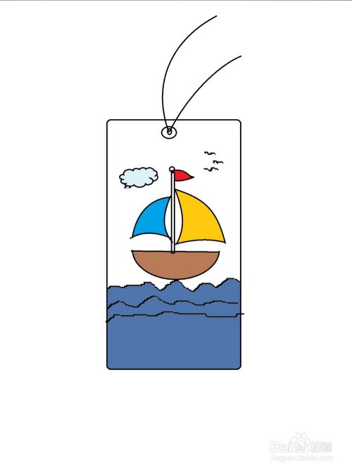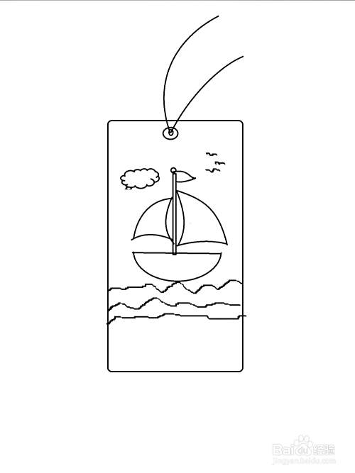 然后在小船下面画出波浪线。在上面画出云朵和小鸟,最后涂上喜欢的颜色,这样一个漂亮的书签就画好了。