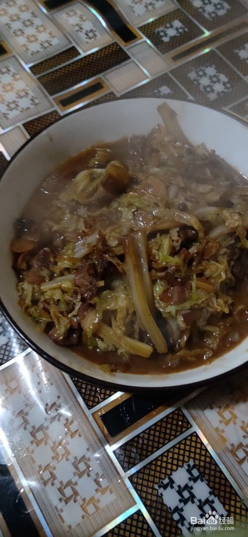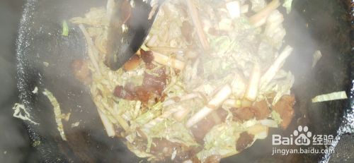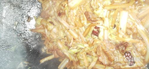 肉炒九分熟,锅中倒入白菜,翻炒均匀,加少许水炖3分钟,白菜变软出锅。