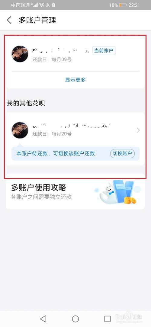 第五步在花呗我的界面,点击多账户管理,可以看到我们开通的多个花呗账号,根据需要使用