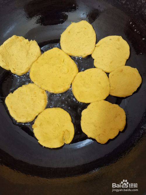 再将锅里加少许油,开小火,再把红薯面团揉圆压成圆饼,放锅里煎,