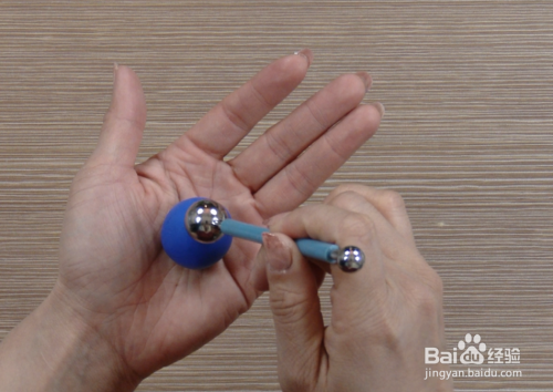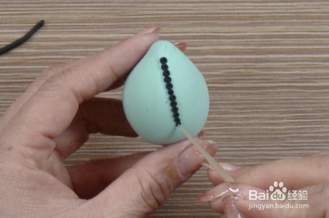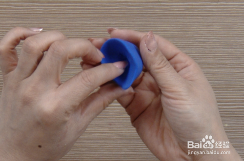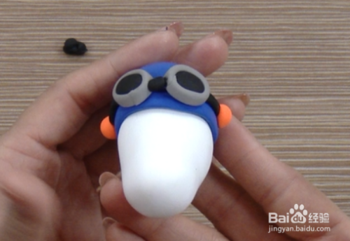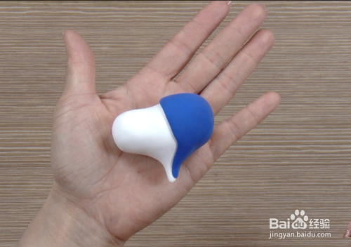 团一个白色泥球,边央做头部,将白泥球整理成小狗头的样子,团一个蓝色泥球,压出凹槽