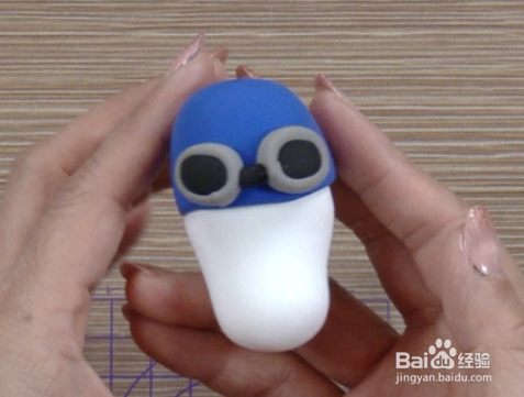 将蓝色泥球整理成帽子的样子,把帽子戴在头上,用黑色和灰色做眼镜粘在头上