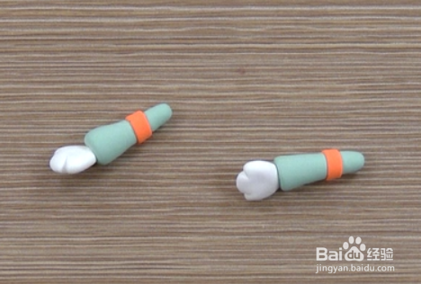 将围巾整理成波罩财浪形,搓一个淡绿色水滴形泥,做身体,搓块肤肥两个淡绿色长方形泥,做鞋子