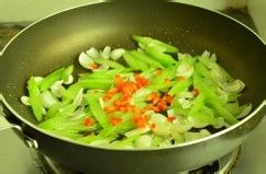 炒至百合呈透明后放入红甜椒丁,调入适量盐拌炒即可!