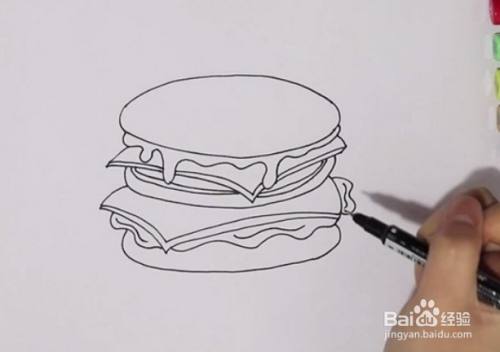接着在芝士片的下面画上肉块,肉块的下面再画上芝士片,芝士片下面画上生菜。