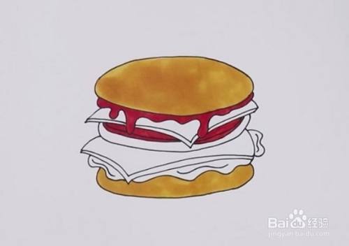 首先画出汉堡的顶部的面包,在下面画上流淌下来的酱汁,在画上一层芝士,再画上肉块、芝士和生菜,最底层画上面包,先给上下的面包涂黄色,番茄酱涂红色,肉片涂红色和棕色,芝士涂金黄色,生菜涂绿色,汉堡简笔画就完成啦!