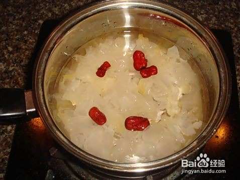 在锅里放清水同时把银耳和红枣一起放进锅里煮。大火锅开后改小火慢煮。