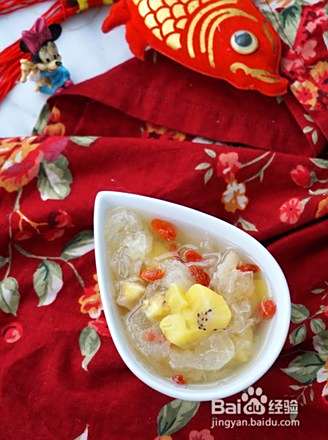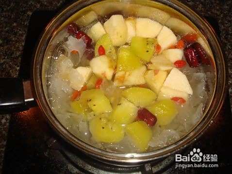 银了耳煮软变绸后就把切好的水果和枸杞一同放进去,加冰糖调味会更好,不用久煮,水果放进去煮沸腾关火就可以了。
