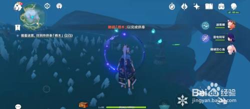 虽然第一天迷雾解除了,但等玩家第二天再进入游戏时鹤观岛再次布满迷雾,类似的任务又多了一个,操作步骤和之前类似,区别在供奉栖木的玩法,玩家需要通过元素痕迹找到紫色的团,将其击碎。完成三处位置后再次迷雾消散。