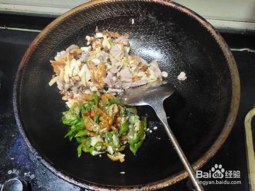 炒出生姜大蒜的香味最后放辣椒,加盐、倒入20克生抽翻转炒5分钟左右出锅