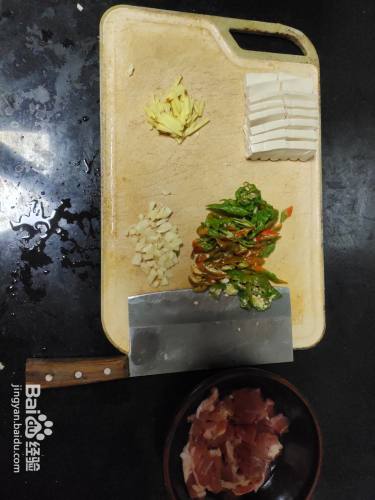 猪肉切片、豆腐切成小块、生姜切丝、大蒜切末、辣椒切斜