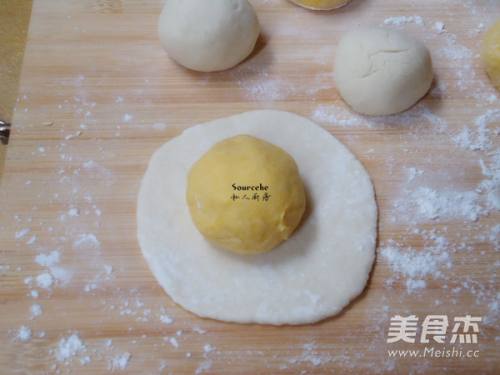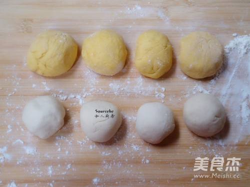 2取100克南瓜料理机打成泥;150克面粉、1.5克酵母,适量水揉成团,另一个50克面粉,酵母,适量温水,揉成白面团;