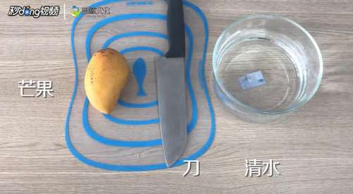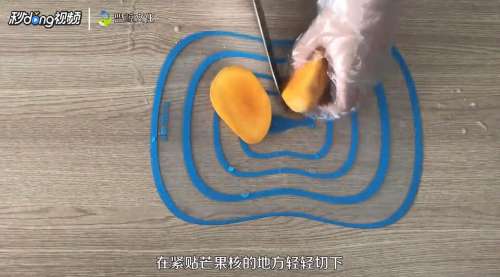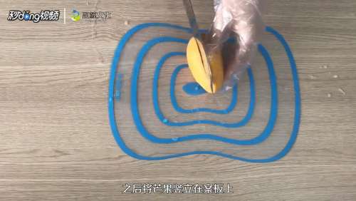 2先将芒果简单清洗一下,之后将芒果竖立在案板上。