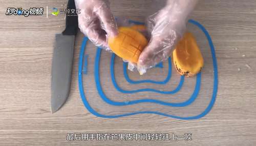 5最后用手指在芒果皮中间轻轻往上一顶,果肉成小块排列即可直接吃。