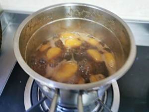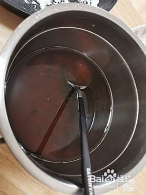 用一个小锅,里面放红糖,300ml 水煮沸,再放入预先捞出的粑粑进去煮。
