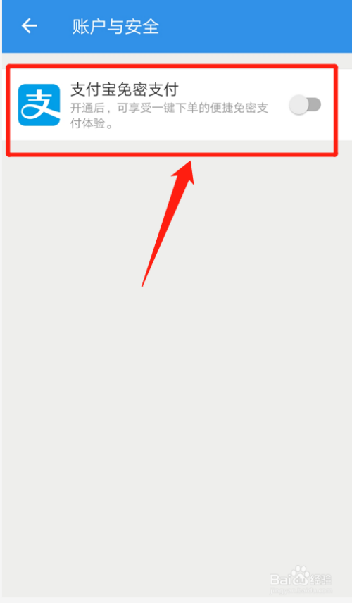 在“账户与安全”窗口中,找到“支付宝免密支付”选项并点击“开关”开启。