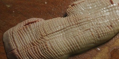 首先去除猪腰里面白色的腺体。